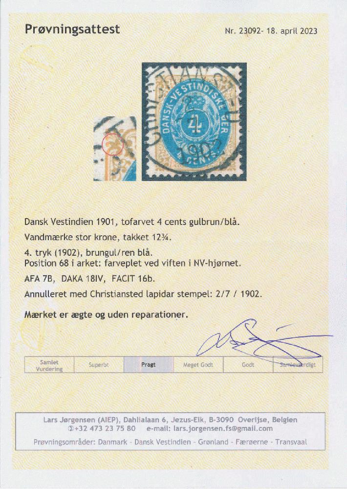 | Zusatzinformationen und Suchstichworte: | Postiljonen 239. Int. Briefmarken Auktion 26. - 29. September 2023 Los 748 Dänisch Westindien Fantastic copy of 4 cents 4th printing with a very well placed "CHRISTIANSTED 2.7 1902". Cert. Lars Jørgensen. SUPERB. Ausruf 150,00 EUR |
