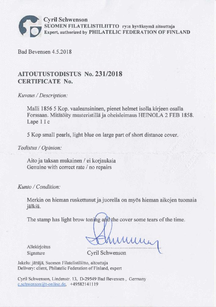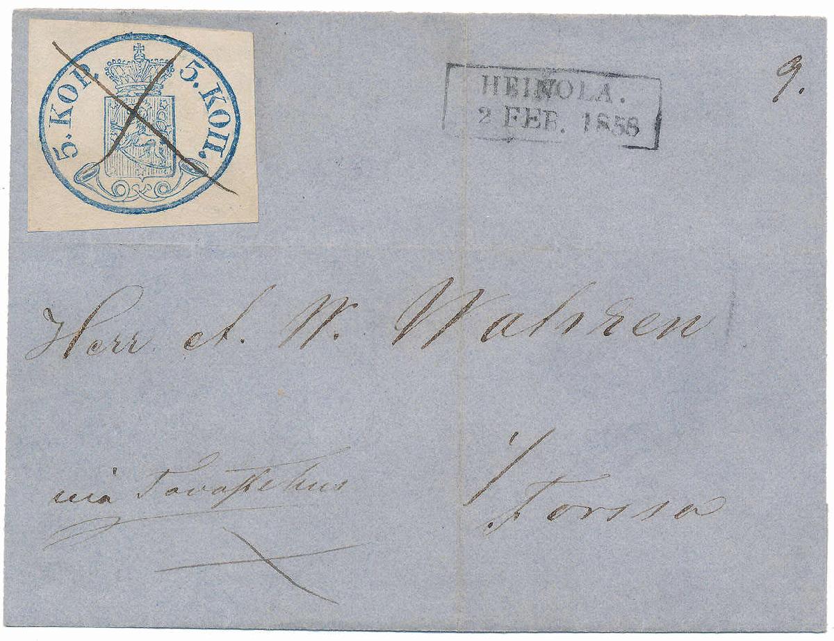 | Zusatzinformationen und Suchstichworte: | Postiljonen 239. Int. Briefmarken Auktion 26. - 29. September 2023 Los 407 Finnland 1856 1. Ausgabe Postmark Rarity Very rare low box "HEINOLA 2 FEB 1858" on a beautiful cover with 5 kopek light blue, small pearls with pen cross. Very good margins, some light toning. Two back flaps missing. Facit RR. Cert. Schwenson Ausruf 2.500,00 EUR |