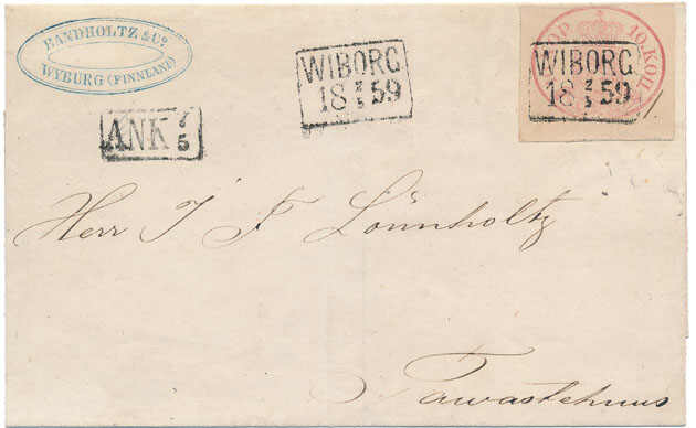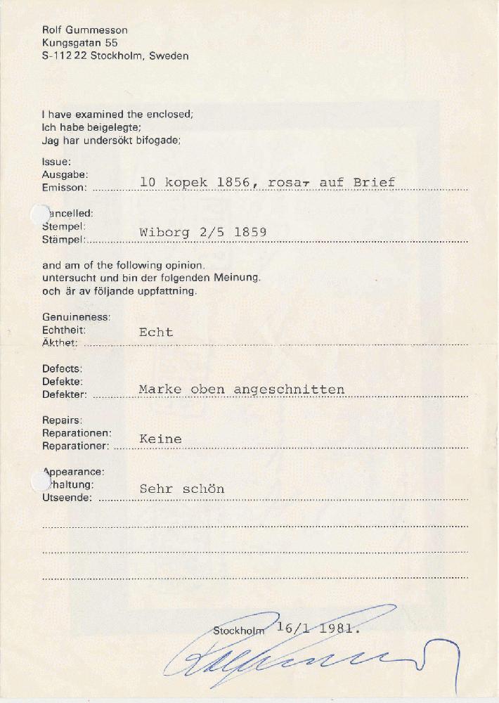| Zusatzinformationen und Suchstichworte: | Postiljonen 239. Int. Briefmarken Auktion 26. - 29. September 2023 Los 414 Finnland 1856 1. Ausgabe A very beautiful cover with 10 kopek rose canc. with high box "WIBORG 2.5 1859". Three wide margins and touching on top. Cert. Gummesson. Ausruf 150,00 EUR |