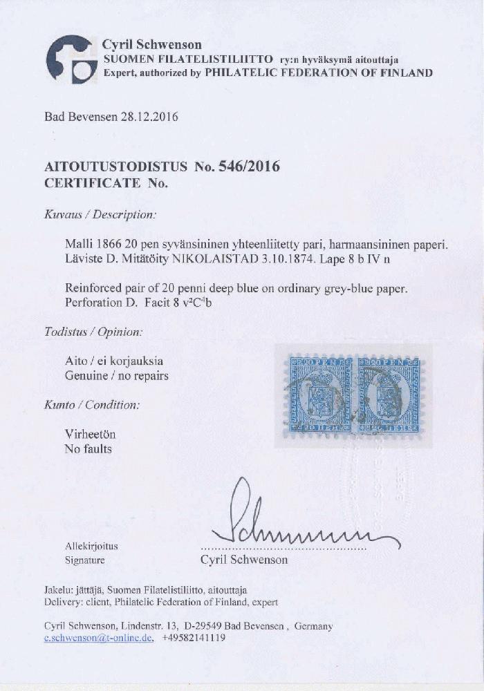 | Zusatzinformationen und Suchstichworte: | Postiljonen 239. Int. Briefmarken Auktion 26. - 29. September 2023 Los 422 Finnland 1860 Wappen durchstochen RARE ROULETTE IV. A fantastic pair of 20 penni deep blue "NIKOLAISTAD 3.10 1874" with absolutely complete perforation. Ex. Gummesson. Sign. RGm & cert. Schwenson. VERY FINE & VERY RARE IN MULTIPLES. Ausruf 1.000,00 EUR |