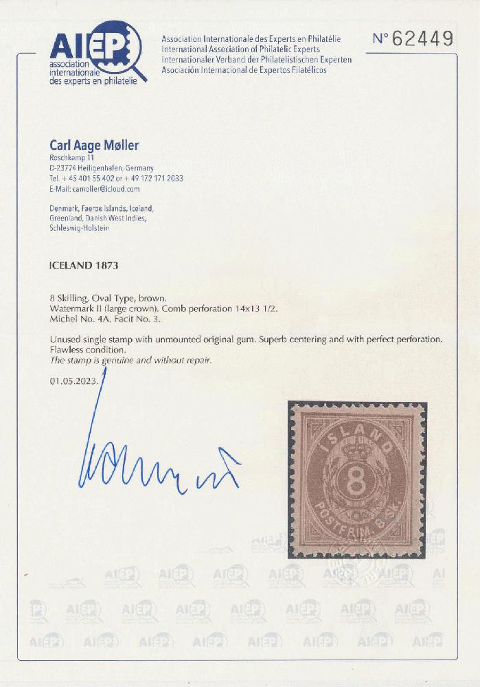 | Zusatzinformationen und Suchstichworte: | Postiljonen 239. Int. Briefmarken Auktion 26. - 29. September 2023 Los 959 Island Skilling Ausgabe NEVER HINGED copy of 8 sk. Very fresh and good centering. VERY FINE - SUPERB. Cert. Møller. Ausruf 400,00 EUR |