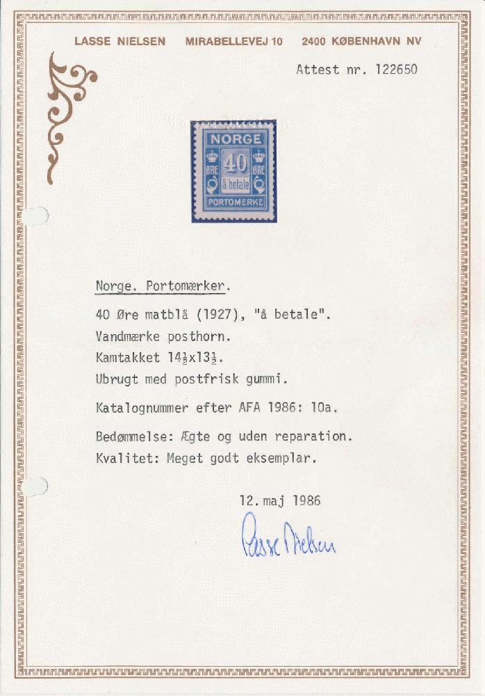 | Zusatzinformationen und Suchstichworte: | Postiljonen 239. Int. Briefmarken Auktion 26. - 29. September 2023 Los 387 Norwegen Postage Due 40 øre "å betale" dull blue in good centering. F=3.500. Cert. Lasse Nielsen & sign. Moldenhauer. VERY FINE. Ausruf 100,00 EUR |
