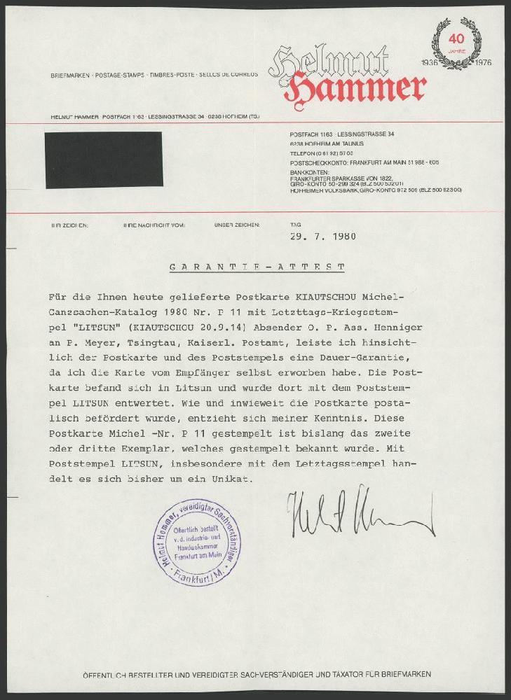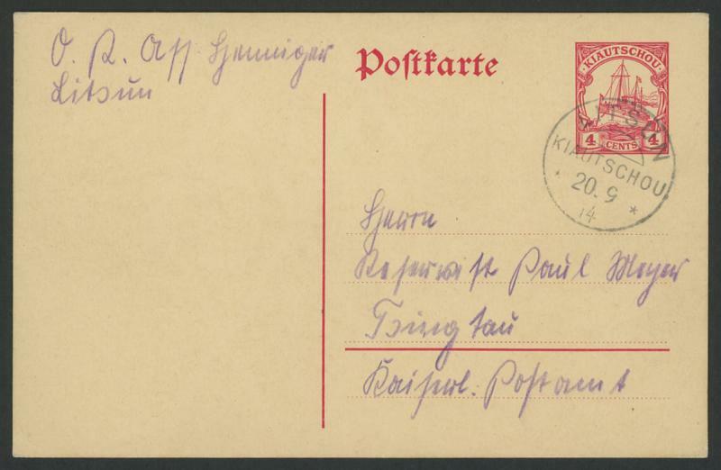 | Zusatzinformationen und Suchstichworte: | 252. Abacus Auktion 28. - 30. Juni 2023 Los 718 Deutsche Kolonien Kiautschou KIAUTSCHOU: 1914 Postal Card with Vertical Dividing Line on the Face & Lozenges Watermark 4c carmine Michel P11 (H&G 11), to Tsingtau with very fine strike of the scarce 'LITSUN/KIAUTSCHOU/20.9/14' cds being the Last Day of Use (confirmed by Friedemann), unpriced used in both catalogues. Superb. Helmut Hammer Certificate (1980) states (translated) that it is only the second or third used example recorded; and with the 'LITSUN' cds is "unikat" (= unique). Sold at Gary Watson's auction of 19.8.1985 for $750. [Higgins & Gage states "#11 in used condition is extremely rare"] Zuschlag 3.000,00 AUD |