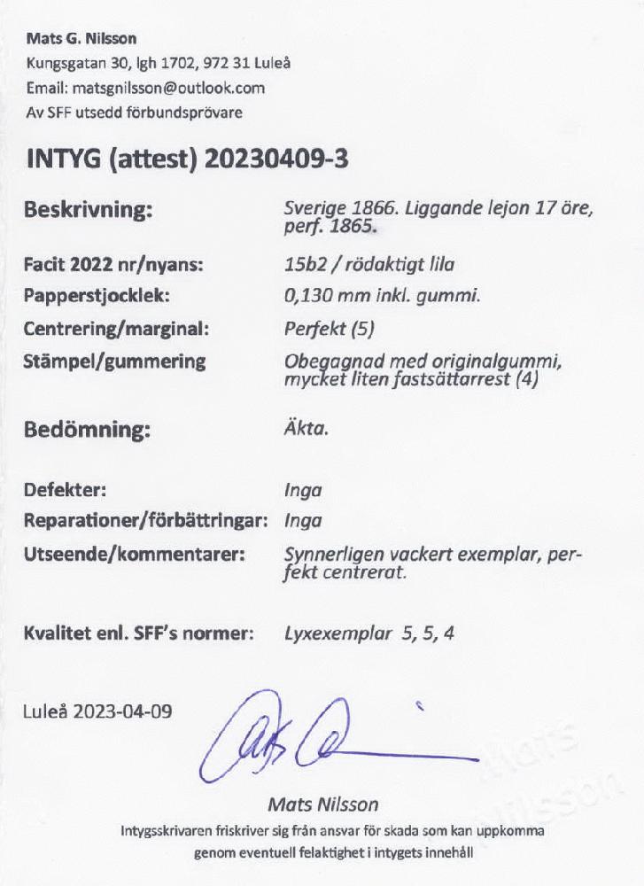 | Zusatzinformationen und Suchstichworte: | Postiljonen 239. Int. Briefmarken Auktion 26. - 29. September 2023 Los 1328 Schweden Löwen Ausgabe Wonderful copy of 17 öre reddish lilac, perfectly centered and with a minimal trace of hinge. F=9.500+. Cert. Mats Nilsson.EXCELLENT 5, 5, 4 Ausruf 500,00 EUR |