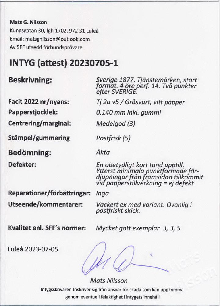 | Zusatzinformationen und Suchstichworte: | Postiljonen 239. Int. Briefmarken Auktion 26. - 29. September 2023 Los 1524 Schweden Variety "two dots after SVERIGE" on 4 öre grey black in never hinged condition. One slightly shorter perf. tip of no importance. F=8.000+. Cert. Mats Nilsson. VERY FINE. Ausruf 150,00 EUR |
