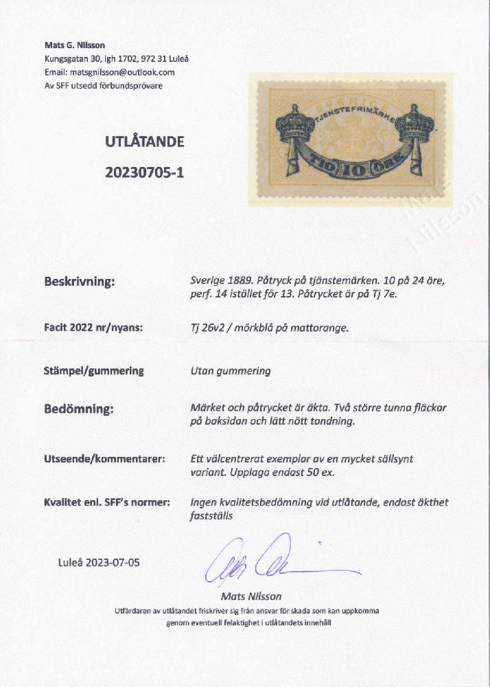 | Zusatzinformationen und Suchstichworte: | Postiljonen 239. Int. Briefmarken Auktion 26. - 29. September 2023 Los 1548 Schweden A very well centered copy of 10/24 öre dull orange perf. 14. Without gum and with imperfections. Opinion Mats Nilsson. RARE STAMP. Ausruf 400,00 EUR |
