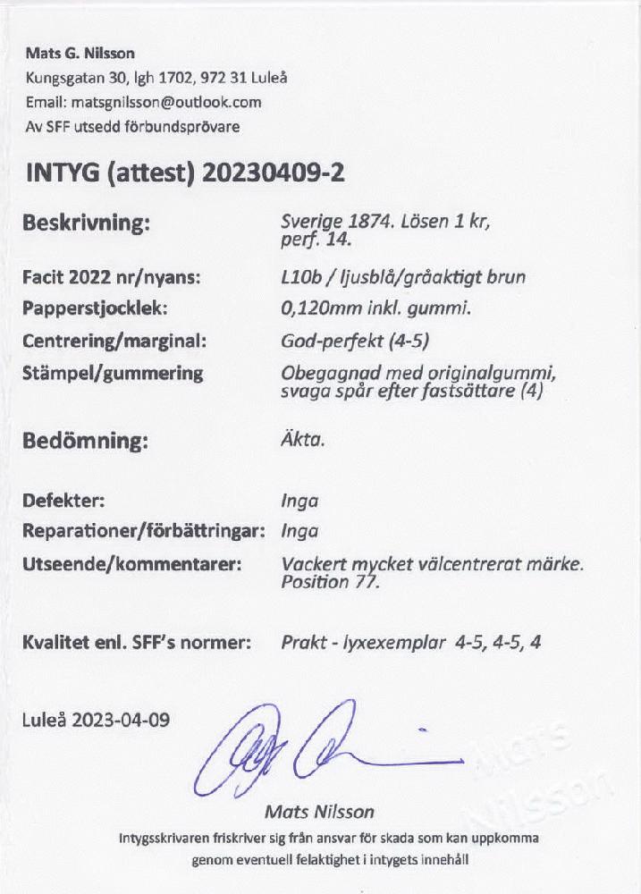 | Zusatzinformationen und Suchstichworte: | Postiljonen 239. Int. Briefmarken Auktion 26. - 29. September 2023 Los 1570 Schweden A wonderful 1 kr. light blue and greyish brown, nearly perfect centering and very small hinge mark. F=5.500+. Cert. Mats Nilsson. SUPERB - EXCELLENT. Ausruf 250,00 EUR |
