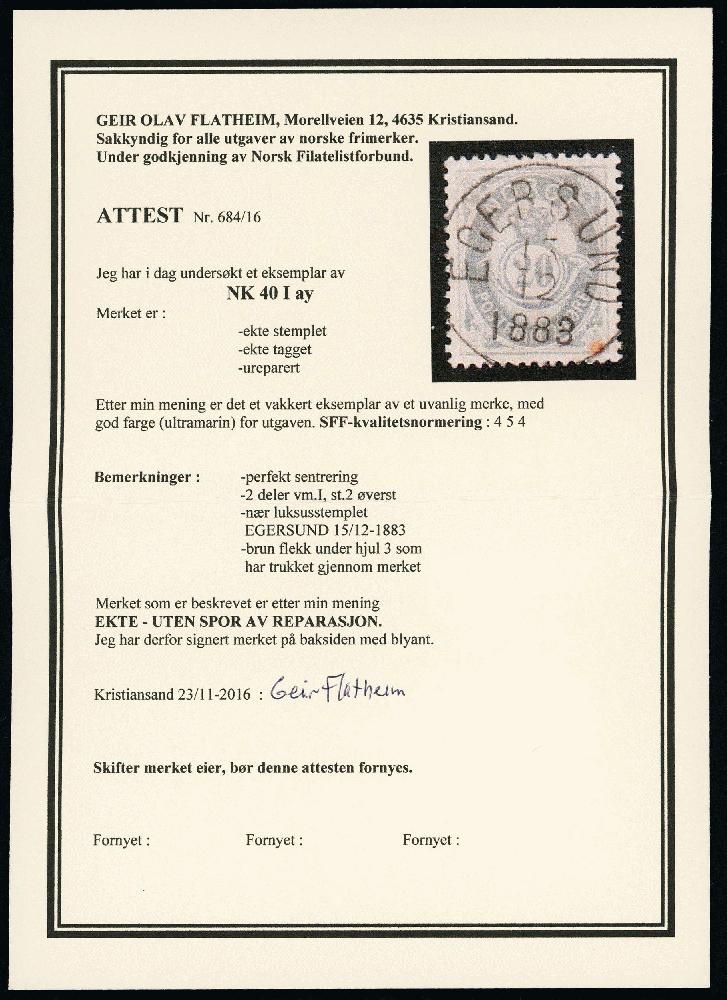| Zusatzinformationen und Suchstichworte: | Skanfil Auktion - Frühling Auktion 2023 4. - 7. Mai 2023 Los 6875 Norwegen NK 35-40 21mm 40 Iay. Pent merke med nær lux EGERSUND 15/12 1883, flekk ved hjul 3. Attest Flatheim, som bl.a. omtaler to deler vm. 1, stilling 2 øverst. (2100) Zuschlag 1.700,00 NOK |