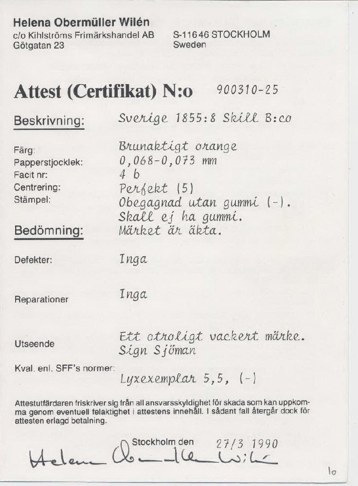 | Zusatzinformationen und Suchstichworte: | Skanfil Auktion - Frühling Auktion 2023 4. - 7. Mai 2023 Los 1207 Schweden Skilling Banco Excellent 8 Skilling Banco 5, 5 An absolutely perfect copy of 8 Sk. Bco brownish orange, as always without gum. A great rarity in this condition. Sign. Sjöman & cert. Obermüller Wilen. EXCELLENT 5, 5, - Ausruf 10.000,00 EUR |