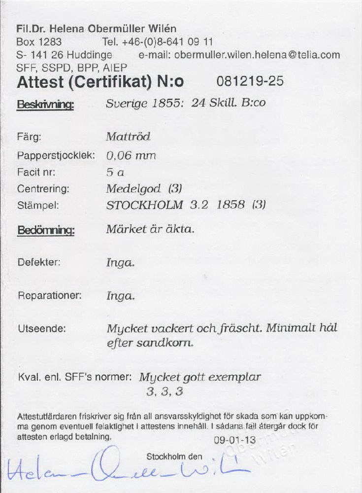 | Zusatzinformationen und Suchstichworte: | Skanfil Auktion - Frühling Auktion 2023 4. - 7. Mai 2023 Los 1221 Schweden Skilling Banco A very beautiful 24 Sk. Bco dull red "STOCKHOLM 3.2 1858". One slightly shorter perf. tip not mentioned in cert. F=18.000. Cert. Obermüller Wilén. VERY FINE. Ausruf 250,00 EUR |