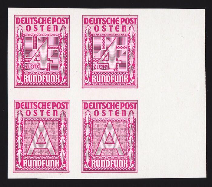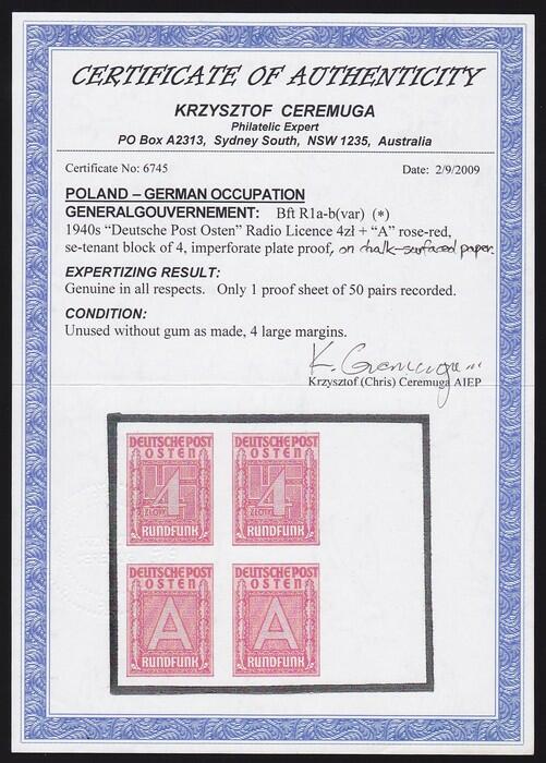 | Zusatzinformationen und Suchstichworte: | Status International Auktion 383 - Briefmarken und Briefe 14. September 2023 Los 2224 Generalgouvernement Poland-General Govt: 1940 Radio Licence Fee 4Zl + 'A' rose-red, IMPERF PLATE PROOF setenant blk of 4 (one for the PO & one for your licence book), thicker chalk-surfaced paper. Superb UN as made, right marginal with all 4 margins. Bft R1a-b(p), Mi 1-2Pl. Only 1 proof sheet of 50 prs recorded. 2009 Ceremuga AIEP photo cert. Ausruf 250,00 AUD |