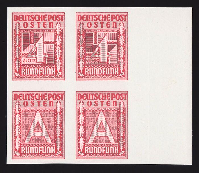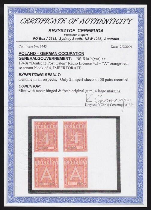 | Zusatzinformationen und Suchstichworte: | Status International Auktion 383 - Briefmarken und Briefe 14. September 2023 Los 2225 Generalgouvernement Poland-General Govt: 1940 Radio Licence Fee 4Zl + 'A' orange-red issued colour, IMPERF setenant blk of 4 (one for the PO & one for your licence book). Superb fresh MNH, right marginal with all 4 margins. Bft R1a-b(var), Mi R1-2u. Very Rare, only 2 imperf sheets of 50 prs recorded. 2009 Ceremuga AIEP photo cert. Ausruf 200,00 AUD |
