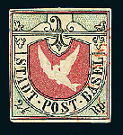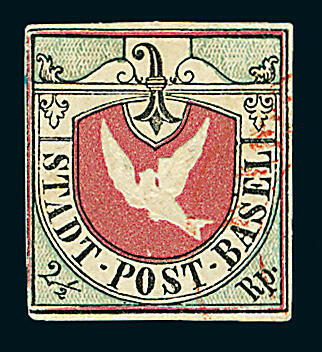 | Zusatzinformationen und Suchstichworte: | Dr. Derichs 173. Auktion Los 910 Schweiz Kanton Basel "Baseler Taube", 2 1/2 Rappen schwarz/weißblau/rotkarmin, "a"-Farbe, dreiseitig breite weiße Ränder, nur links unten äußere schwarze Einfassungslinie teilweise getroffen, schön das Markenbild freilassend gestempelt mit zartem roten Zweikreisstempel von Basel. Ein ursprünglich und frisch erhaltenes Exemplar dieser so prominenten Marke. Fotoattest Dr. Fulpius (1943) und Fotoattest Eichele SBPV: "echt und einwandfrei". (Michel 15.000.-) Ausruf 2.500,00 EUR |