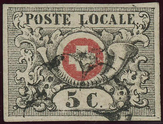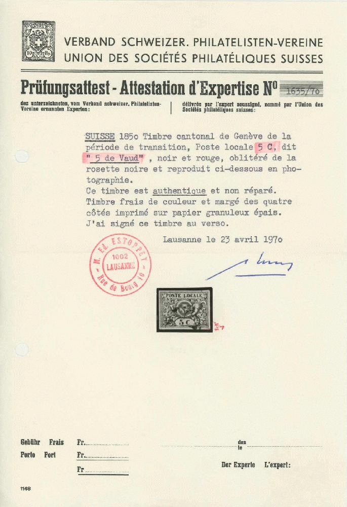 | Zusatzinformationen und Suchstichworte: | 10. Heuberger-Auktion 29. - 30. September 2023 Los 483 Schweiz Übergangszeit, Waadt, Neuenburg, Winterthur Waadt 5 C., 50. Marke des Bogens mit Plattenfehler: Diverse schwarze Flecken um Poste Locale, ein farbintensives und allseits gleichmässig gut gerandetes Stück (winzige, natürliche Sandkorn-Punkte im Papier), zart entw. mit schwarzer Genfer Rosette (AW 3). Ein schönes Exemplar, zudem noch mit dieser seltenen Entwertung, die nur in den ersten zwei Januarwochen 1851 verwendet wurde, sign. ED (Diena), Estoppey; Atteste Estoppey (1970), Hermann (2023) Corinphila Handbuch & Spezialkatalog = 2'500 + 20%. Ausruf 600,00 CHF |