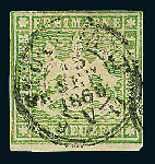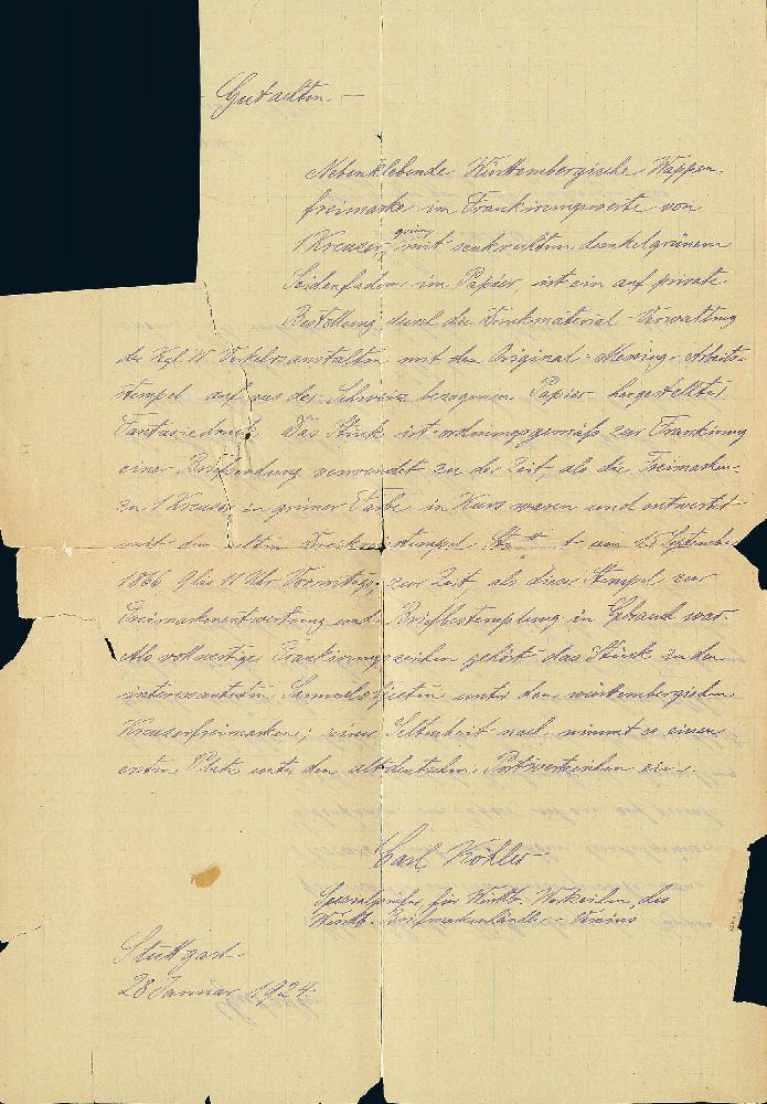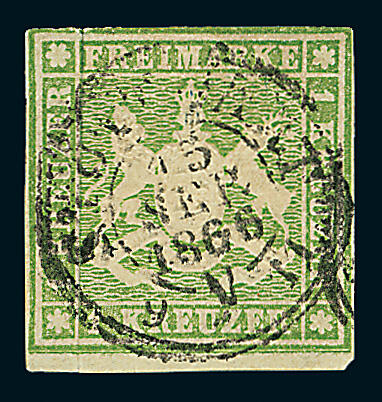 | Zusatzinformationen und Suchstichworte: | Dr. Derichs 172. Auktion - TROST Teil VII 14. Oktober 2023 Los 2177 Altdeutschland Württemberg \NEUDRUCK VON MAI 1865 - ECHT GEBRAUCHT\: 1 Kreuzer grün auf weißem dünnen Papier (0,07mm), oben mit der Randlinie geschnitten und sonst weißrandig mit K3 "Stuttgart 15 Sep.1866". Die Neudrucke der III. Ausgabe, von der württembergischen Post amtlich hergestellt, kommen nahezu ausschließlich in ungebrauchter Erhaltung vor, waren aber frankaturgültig. Bei dieser Marke handelt es sich um ein UNIKAT. Gutachten Carl Köhler (1924), Fotoattest Thoma BPP und neues Fotoattest Heinrich BPP: "Das einmalige Prüfstück stellte eine ganz außergewöhnliche Rarität der Württemberg-Philatelie dar. Es ist nur noch ein weiteres gebrauchtes Exemplar der 'Faiburn-Nachdrucke' bekannt (in brauner Farbe)!". Ausruf 2.000,00 EUR |