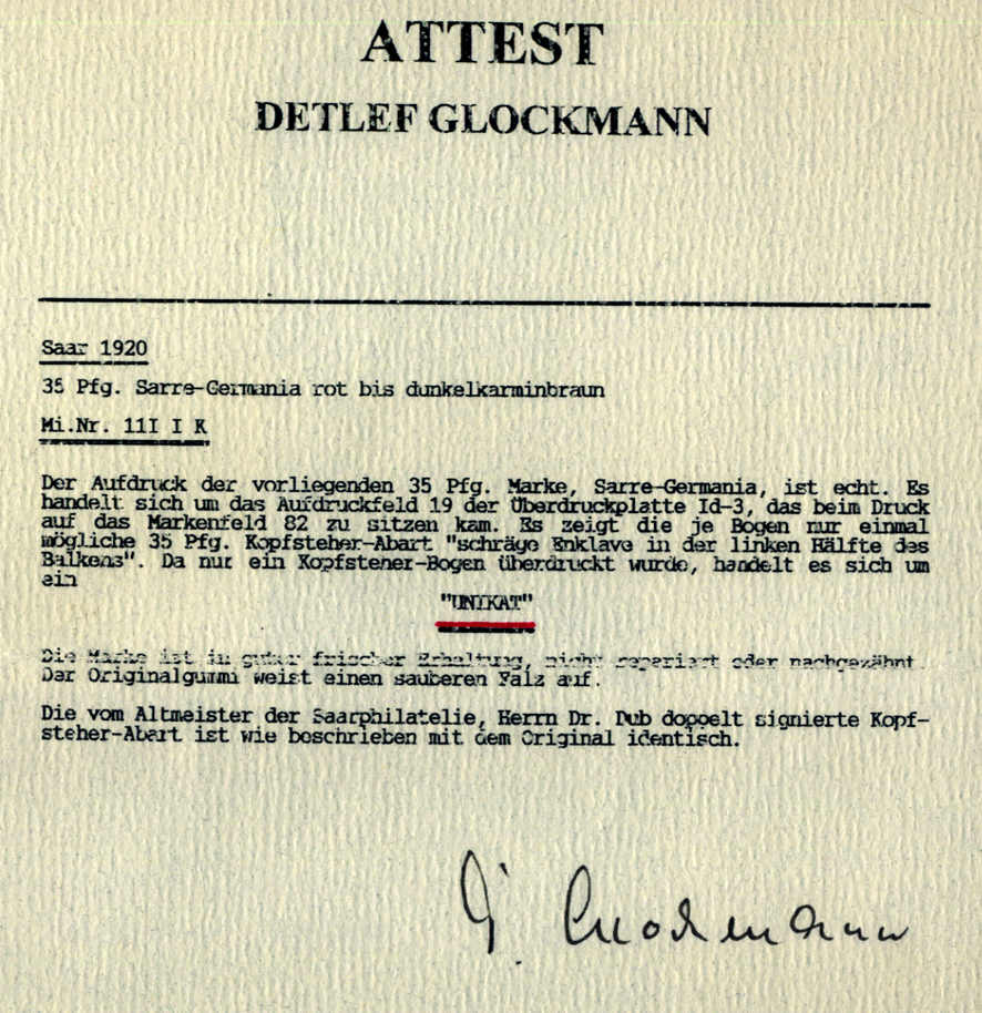 | Zusatzinformationen und Suchstichworte: | AAK Phila GmbH 79. Auktion 14. - 16. September 2023 Los 5686 (D) Saar 35 Pf Germania-Sarre m. kopfsteh. Aufdruck (Linse im Balken), ungebr. Luxus, je doppelt gepr. Dr. Dub u. einwandfr. Attest Glockmann Ausruf 120,00 EUR |