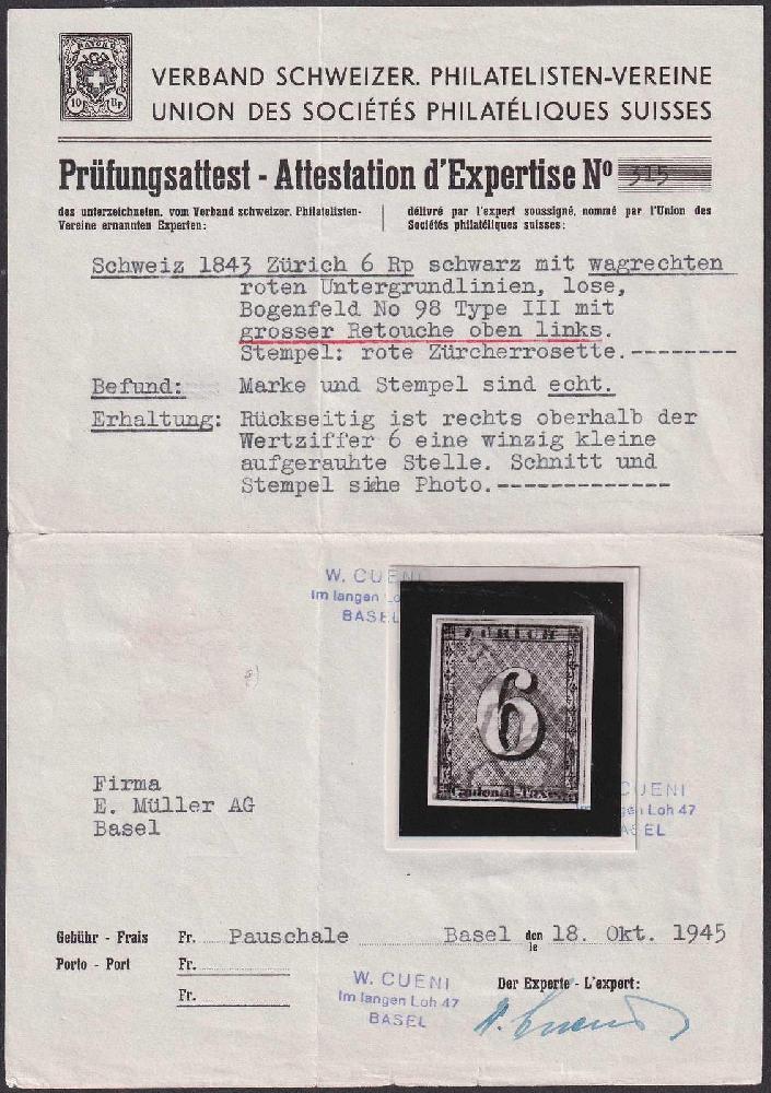 | Zusatzinformationen und Suchstichworte: | Luzernerraute Webshop Los 0000102053 Schweiz Kanton Zürich ZÜRICH 6, Type 98 (T.III), grosse Retusche oben links (mit Fehlstelle im oberen Bereich 2W.3.03), stempelfreie Abart, SBK: 6'500.-+ Erstklassige Altschweiz-Marke Festpreis 2.200,00 CHF |