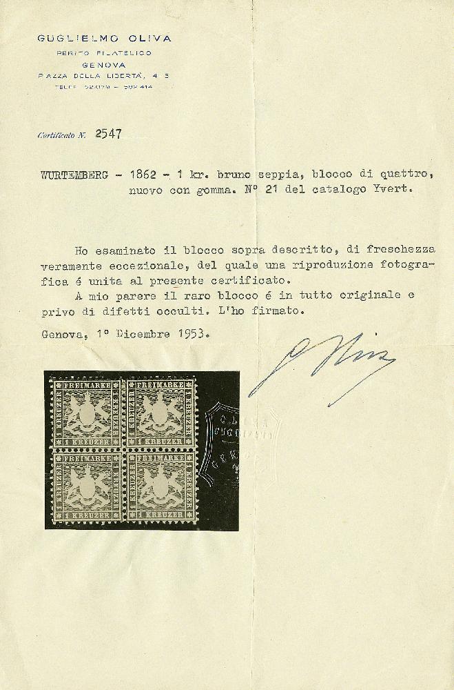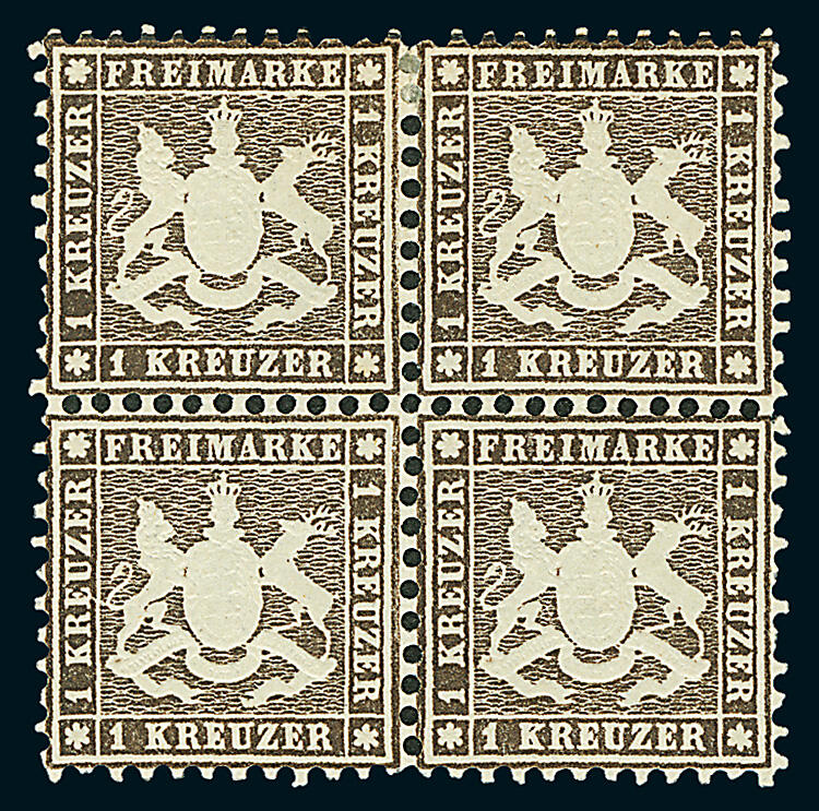 | Zusatzinformationen und Suchstichworte: | Dr. Derichs 172. Auktion - TROST Teil VII 14. Oktober 2023 Los 2194 Altdeutschland Württemberg 1 Kreuzer schwarzbraun, ungebrauchter Viererblock mit vollständiger Originalgummierung, die für das untere Doppelstück das Prädikat "POSTFRISCH" erfordert. Aufgrund besonderer Druckmerkmale ist die Einheit als vom Oberrand stammend zu identifizieren, oberes Paar minimal angetrennt und rechts unauffällige ausgabetypische Zahnunebenheiten, sonst einwandfrei. Die linke unter Marke mit ARGE-Plattenfehler "I" ("Strich unter erstem E von linkem KREUZER") und die rechte untere Marke mit ARGE-Plattenfehler "V" ("oben neben A feiner Strich bis zur Krone des Wappens"). Eine "normal" schon extrem seltene und mit den beiden Plattenfehlern einmalige Einheit. Fotoattest Oliva (1953) mit Bleistiftsignatur, sonst unsigniert, Fotoattest Thoma BPP (1988) und neues Fotoattest Heinrich BPP. (Michel 3.200.-+++, das ist der Preis für vier ungebrauchte Marken ohne Aufschläge für die Einheit, die beiden Plattenfehler und die beiden Marken in postfrischer Erhaltung.) Ausruf 1.000,00 EUR |