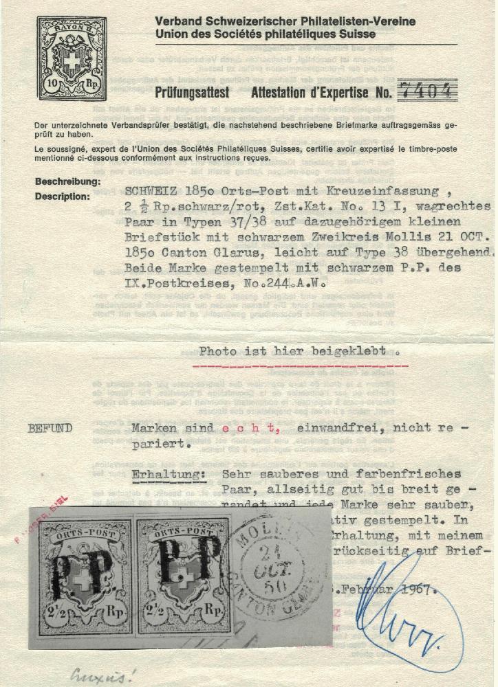 | Zusatzinformationen und Suchstichworte: | Dr. Derichs 173. Auktion 4. November 2023 Los 922 Schweiz "Orts-Post" 2 1/2 Rappen grauschwarz/dunkelorangerot, Kreuz mit schwarzer Linieneinfassung, waagerechtes Paar (Typen 37 und 38), vierseitig breitrandig bzw. meist mit Trennungslinien, auf Briefstück mit zwei idealen schwarzen "P.P."-Stempeln vom IX. Postkreis auf jeder Marke einzeln, unten mit leichter Tintenspur und mit übergehendem K2 "Mollis Canton Glarus 21 Oct.50". Das Doppelstück war zur Prüfung gelöst und ist exakt mit Falz replaziert. Ein bildschönes Luxusstück. Ausruf 2.000,00 EUR |