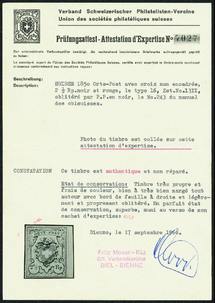 | Prüfer: | Moser-Räz, Fritz (SBPV / ASEP (Schweizerischer Briefmarken-Prüfer-Verband)) |