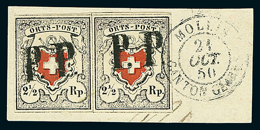 | Zusatzinformationen und Suchstichworte: | Gert Müller 119. Auktion 24. - 26. August 2023 Los 3536 Schweiz ORTS-POST VOM BOGENRAND: 2 1/2 Rp. Orts-Post ohne Kreuzeinfassung, Type 16, wundervoll farbfrisches, allseits perfekt gerandetes Luxusstück, rechts mit Bogenrand und zentrisch leicht und sauber aufgesetztem "P.P." vom Postkreis IX. Ein traumhaftes Exemplar in erlesener Qualität, zumal Randstücke dieser Ausgabe nahezu unbekannt sind. Zuschlag 1.800,00 EUR |