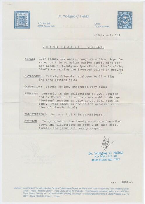 | Zusatzinformationen und Suchstichworte: | Status International Auktion 383 - Briefmarken und Briefe 14. September 2023 Los 2735 Nepal 1917-30 Bow & Arrow & Kukris ½a red-orange, on native paper, imperf (position 35). Superb UN as issued, 4 large margins. Mi 14, Sc 11 cat US$1750, SG 35 cat £1200 & much undercatalogued as vast majority on the market are forgeries. The key standard stamp of Nepal Ausruf 800,00 AUD |