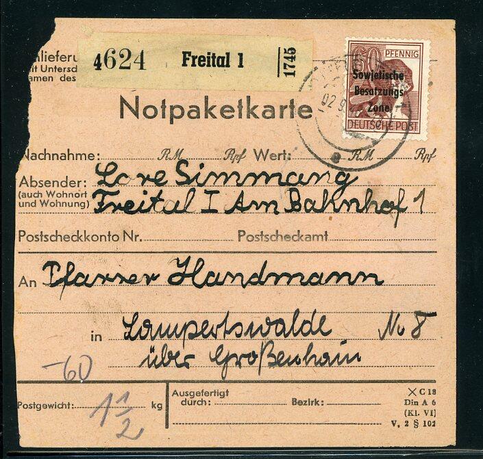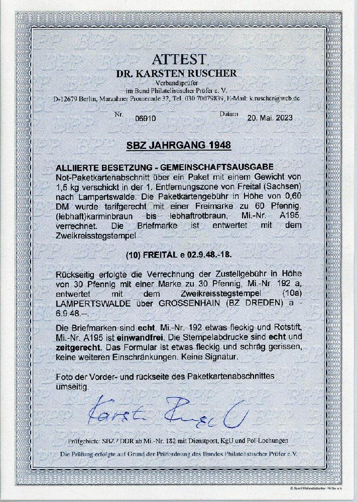 | Zusatzinformationen und Suchstichworte: | 28. Briefmarkenhandel Dessau Auktion 13. Oktober 2023 Los 762 SBZ allgemeine Ausgabe SBZ-Aufdruck - EF 60 Pfg. auf Notpaketkarte nach Lamperstwalde von "FREITAL 2.9.48", rücks. 30 Pfg. als Zustellgebühr, Foto-Attest Dr. Ruscher BPP Ausruf 50,00 EUR |