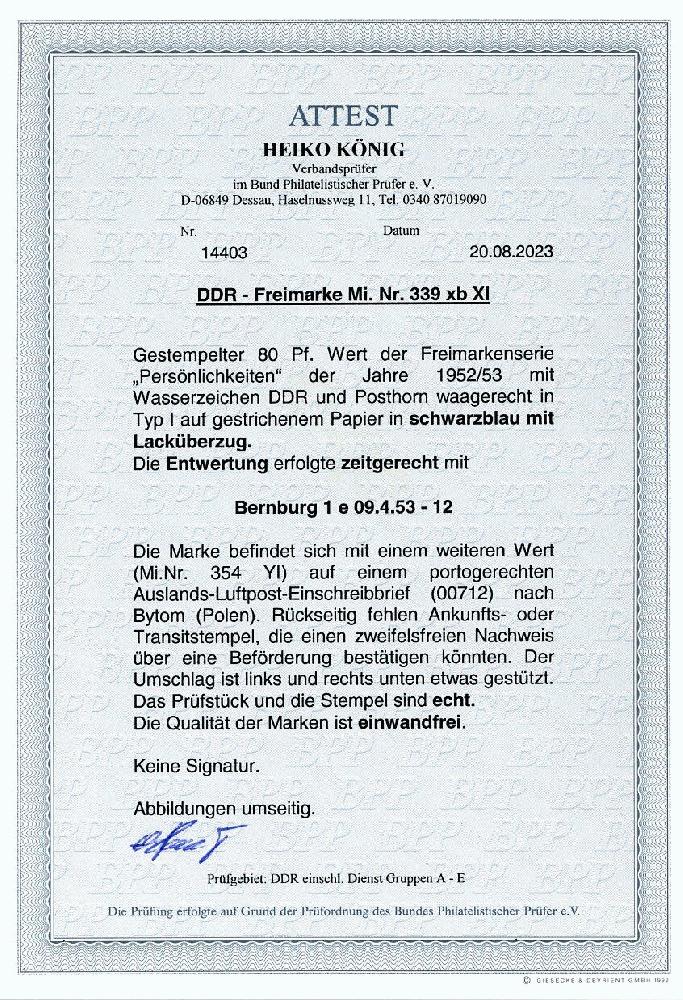 | Zusatzinformationen und Suchstichworte: | 28. Briefmarkenhandel Dessau Auktion 13. Oktober 2023 Los 806 DDR Köpfe II - 80 Pfg. schwarzblau mit Lacküberzug und 35 Pfg. Gorki, portogenau auf Luftpost-Auslands-R-Brief nach Polen von "BERNBURG 9.4.53", sehr seltene Kombination, Auslandsbriefe mit 80-Pfg.-Lack sind bisher nicht bekannt, aktuelles Foto-Attest König BPP, Mi. 2000,- Ausruf 500,00 EUR |