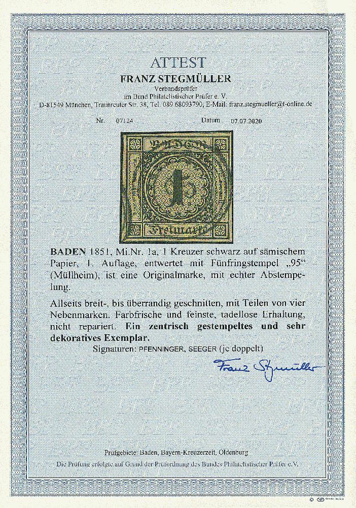 | Zusatzinformationen und Suchstichworte: | Dr. Derichs 173. Auktion 4. November 2023 Los 500 Altdeutschland Baden 1 Kreuzer schwarz auf sämisch, erste Auflage, ringsum breit- bis überrandig mit Teilen bzw. Ansätzen von vier Nachbarmarken, gemittet aufgesetzter Nummernstempel "95" MÜLLHEIM. Luxus. Ein ganz ungewöhnlich qualitätsvolles Exemplar der ersten Marke dieses Landes, die gleichzeitig die erste Marke Deutschlands im Michel-Katalog ist. Fotoattest Seeger BPP und Fotoattest Stegmüller BPP: "Farbfrische und feinste, tadellose Erhaltung, nicht repariert.". (Michel 1.000.-+). Ausruf 350,00 EUR |