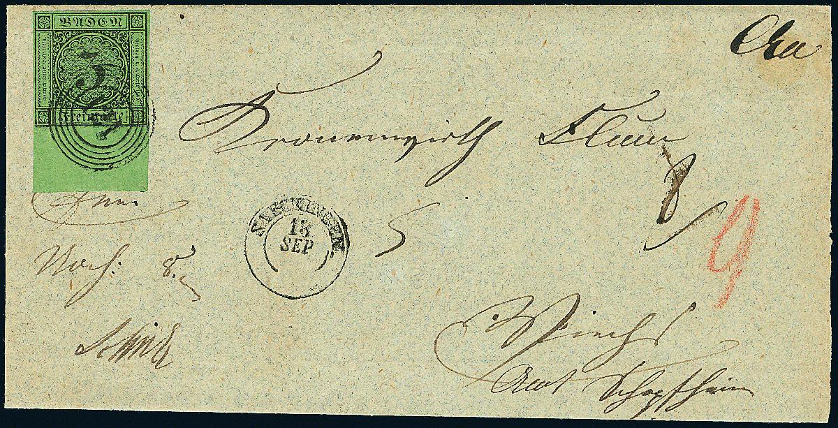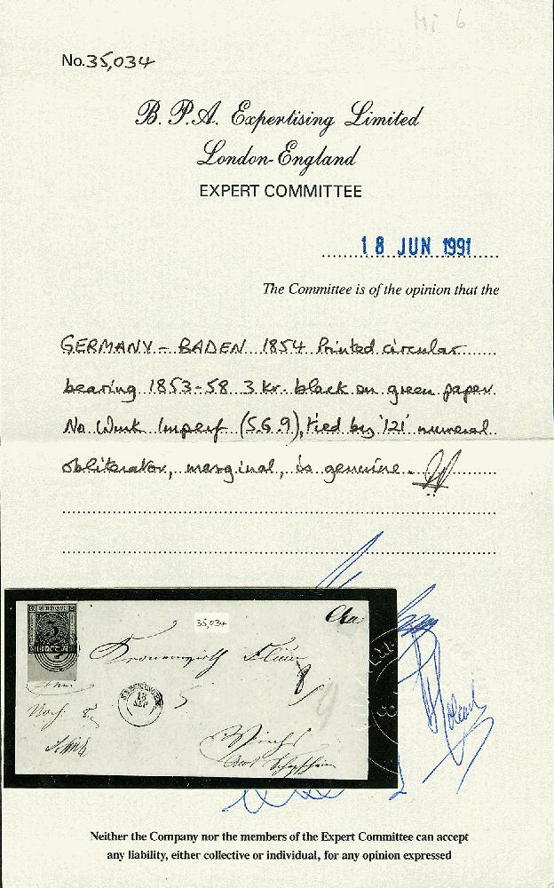 | Zusatzinformationen und Suchstichworte: | Dr. Derichs 173. Auktion 4. November 2023 Los 507 Altdeutschland Baden 3 Kreuzer schwarz auf grün, großes Unterrandstück mit 13mm breitem Bogenrand, auch an den anderen drei Seiten gleichmäßig voll- bis breitrandig, auf Brief mit klarem Nummernstempel "121" und Aufgabe-K2 "Saeckingen 18 Sep." (1854). Mit vollständigem, teils gedruckten Inhalt "Liquid-Erkenntniß" des Großherzoglich Badischen Bezirksamts Säckingen. Luxus. Fotoattest British Philatelic Association. Ausruf 200,00 EUR |