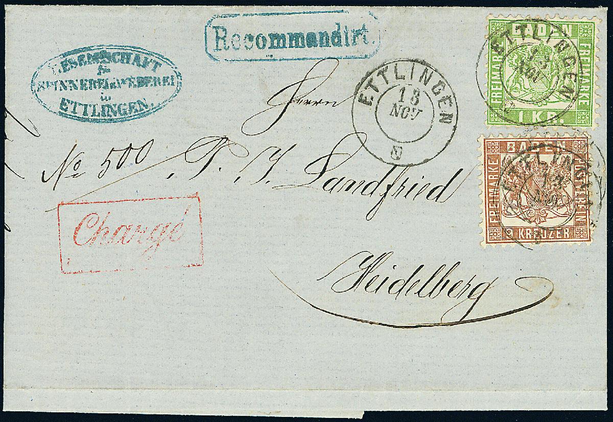 | Zusatzinformationen und Suchstichworte: | Dr. Derichs 173. Auktion 4. November 2023 Los 514 Altdeutschland Baden 9 Kreuzer dunkelbraun, beste Farbe "c", in Mischfrankatur mit der letzten Ausgabe 1 Kreuzer grün auf Einschreibbrief mit K2 "Ettlingen 13 Nov." (1869) nach Heidelberg, nebengesetzt blauer Ra1 "Recommandirt." (privater Absenderstempel) und amtlicher roter Ra1 "Charge". Die 9-Kreuzer-Marke ist lagerungsbedingt stellenweise gering verfärbt, sonst in tadelloser und ursprünglicher Qualität. Tarifgerechte 10-Kreuzer-Frankatur mit 3 Kreuzer Brieftaxe und 7 Kreuzer Einschreibgebühr. Fotoattest Stegmüller BPP: "In Kombination mit der dunkelbraunen Nuance handelt es sich um eine seltene Mischfrankatur.". (Michel 3.800.-) Ausruf 600,00 EUR |