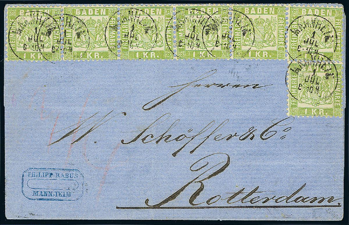 | Zusatzinformationen und Suchstichworte: | Dr. Derichs 173. Auktion 4. November 2023 Los 515 Altdeutschland Baden 1 Kreuzer grün, waagerechter Fünferstreifen und zwei Einzelmarken auf Brief mit K1 "Mannheim 1 Jul." (1871) nach Rotterdam/Niederlande. Luxus. Portorichtige 7-Kreuzer-Frankatur nach dem Tarif von 1871, wovon 3/4 Silbergroschen als Weiterfranko zu vergüten war. Sowohl der Fünferstreifen als große Einheit als auch die Mehrfachfrankatur von sieben Exemplaren stellen eine große Seltenheit für die letzte Markenausgabe Badens dar. Fotoattest Stegmüller BPP: "Farbfrische und feine, tadellose Erhaltung, nicht repariert." Ausruf 1.000,00 EUR |