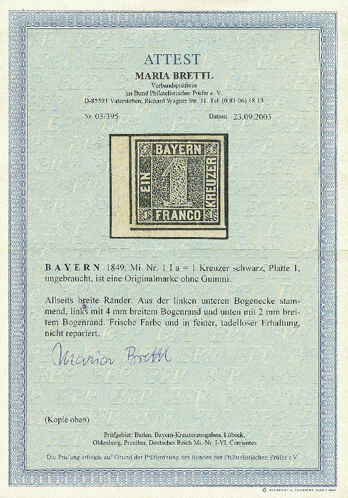 | Zusatzinformationen und Suchstichworte: | Dr. Derichs 173. Auktion 4. November 2023 Los 522 Altdeutschland Bayern \BOGENECKE UNTEN LINKS\: 1 Kreuzer schwarz, Platte 1, tieffarbig mit 4mm breitem Bogenrand links und 2mm Bogenrand unten, oben breitrandig und rechts sogar mit vollständiger Zwischenlinie, ungebraucht ohne Gummierung. Luxus. Eine rückseitig erkennbare kleine Aufspaltung befindet sich nur im weiten Bogenrand und stellt keinen Mangel dar. Fotoattest Brettl BPP: "Frische Farbe und in feiner, tadelloser Erhaltung, nicht repariert." Ausruf 400,00 EUR |