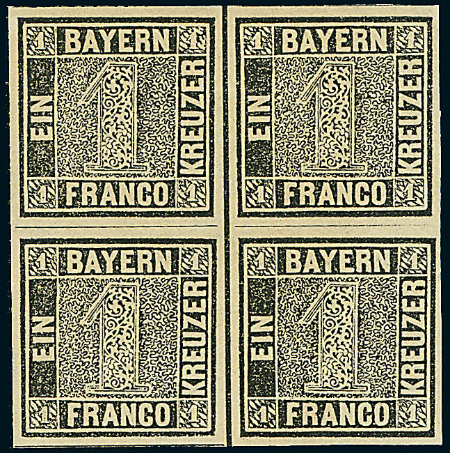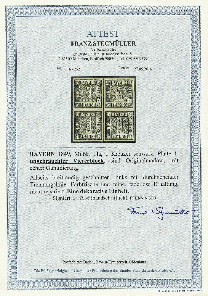 | Zusatzinformationen und Suchstichworte: | Dr. Derichs 173. Auktion 4. November 2023 Los 523 Altdeutschland Bayern 1 Kreuzer schwarz, Platte 1, ungebrauchter Viererblock mit originaler Gummierung, allseits breitrandig geschnitten bzw. links sogar mit vollständiger Zwischenlinie. Luxus. Ein schönes Blockstück dieser prominenten Marke. Bleistiftsignatur Bolaffi, geprüft Pfenninger und Fotoattest Stegmüller BPP: "Farbfrische und feine, tadellose Erhaltung, nicht repariert. Eine dekorative Einheit.". (Michel 6.000.-) Ausruf 2.500,00 EUR |