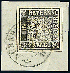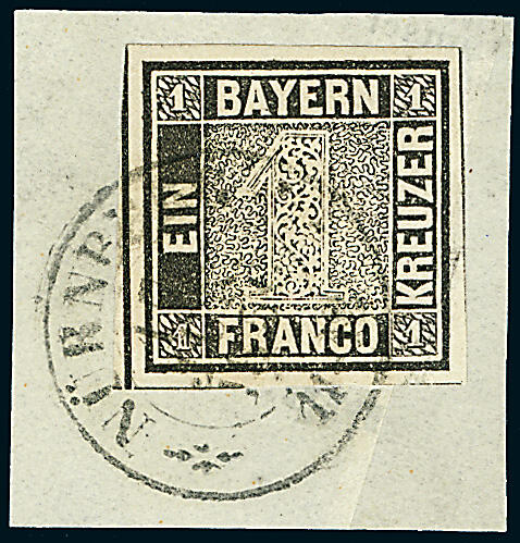 | Zusatzinformationen und Suchstichworte: | Dr. Derichs 173. Auktion 4. November 2023 Los 524 Altdeutschland Bayern 1 Kreuzer schwarz, Platte 1, sehr tiefe intensive Farbe, allseits breitrandig bzw. an drei Seiten sogar mit Zwischenlinien, auf Briefstück (nur dieses aus optischen Gründen rechts schräg hinterlegt) mit vollständig aufgesetztem K2 "Nürnberg 17 Jun.1850". Luxus. Briefstücke dieser ersten Deutschen Briefmarke mit vollständigem Ortsstempelabschlag sind wesentlich seltener als lose Marken und verdienen einen entsprechenden Aufschlag Ausruf 1.250,00 EUR |