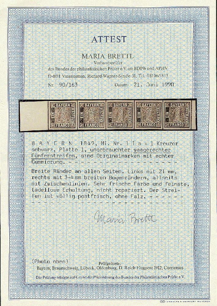 | Zusatzinformationen und Suchstichworte: | Dr. Derichs 173. Auktion 4. November 2023 Los 525 Altdeutschland Bayern 1 Kreuzer grauschwarz, Platte 1, waagerechter FÜNFERSTREIFEN, links mit 19,5mm und rechts mit 4mm breiten Bogenrändern, oben mit nahezu durchgehenden Zwischenlinien, unten mit durchgehenden und sogar überall "freistehenden" Zwischenlinien, völlig postfrisch in ausgesuchter Luxus-Qualität. Die erste, dritte und fünfte Marke, welche den Bogenfelder A36, A38 und A40 entsprechen, zeigen die Plattenfehler "linke untere Ecke beschädigt", "Ausbuchtung der äußeren Rahmenlinie über N von BAYERN" und "weißer Fleck in der Randlinie über dem rechten oberen Wertziffernquadrat". Eine besonders wertvolle Pretiose der ersten Deutschen Briefmarke und ein großartiger Start für eine bedeutende Deutschland-Sammlung. Ohne Signaturen, Fotoattest Brettl BPP (1990) und Fotoattest Stegmüller BPP: "Ursprüngliche und feinste, tadellose Erhaltung, nicht repariert. Eine außerordentlich frische und seltene Einheit." Ausruf 8.000,00 EUR |