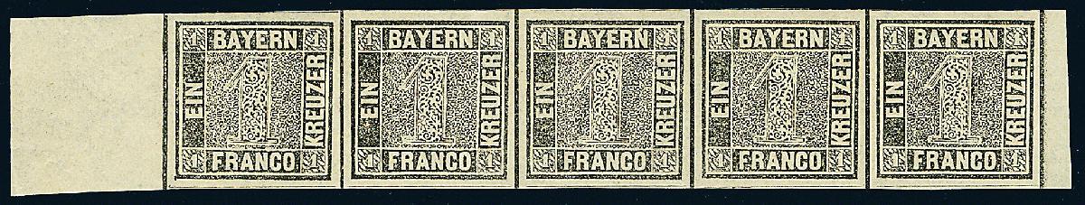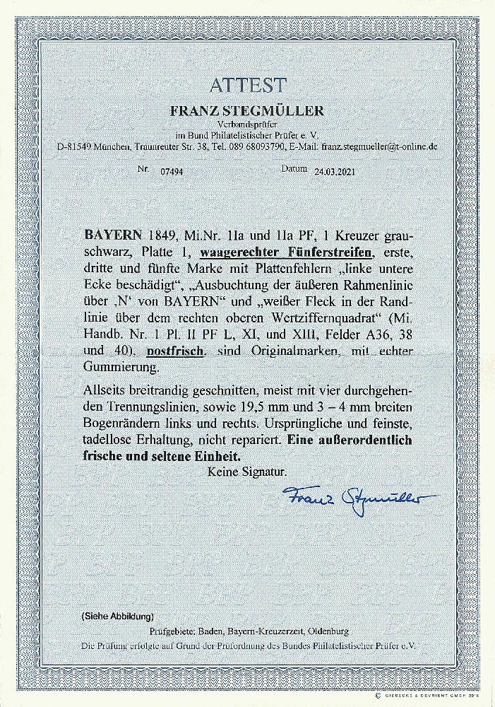 | Zusatzinformationen und Suchstichworte: | Dr. Derichs 173. Auktion 4. November 2023 Los 525 Altdeutschland Bayern 1 Kreuzer grauschwarz, Platte 1, waagerechter FÜNFERSTREIFEN, links mit 19,5mm und rechts mit 4mm breiten Bogenrändern, oben mit nahezu durchgehenden Zwischenlinien, unten mit durchgehenden und sogar überall "freistehenden" Zwischenlinien, völlig postfrisch in ausgesuchter Luxus-Qualität. Die erste, dritte und fünfte Marke, welche den Bogenfelder A36, A38 und A40 entsprechen, zeigen die Plattenfehler "linke untere Ecke beschädigt", "Ausbuchtung der äußeren Rahmenlinie über N von BAYERN" und "weißer Fleck in der Randlinie über dem rechten oberen Wertziffernquadrat". Eine besonders wertvolle Pretiose der ersten Deutschen Briefmarke und ein großartiger Start für eine bedeutende Deutschland-Sammlung. Ohne Signaturen, Fotoattest Brettl BPP (1990) und Fotoattest Stegmüller BPP: "Ursprüngliche und feinste, tadellose Erhaltung, nicht repariert. Eine außerordentlich frische und seltene Einheit." Ausruf 8.000,00 EUR |
