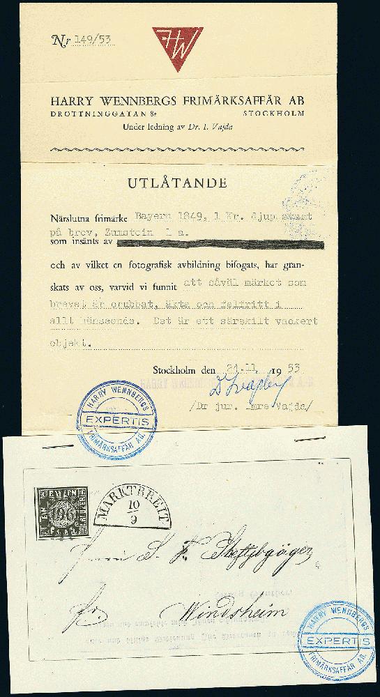 | Zusatzinformationen und Suchstichworte: | Dr. Derichs 173. Auktion 4. November 2023 Los 528 Altdeutschland Bayern 1 Kreuzer schwarz, Platte 2, Plattenfehler "weißer Fleck an Y und E von BAYERN" (laut Michel-Handbuch "PF III"), oben und rechts voll- bis breitrandig bzw. links und unten mit vollständigen Zwischenlinien, auf Drucksache (Name des Adressaten unauffällig überschrieben) mit ideal gemittet aufgesetztem geschlossenen Mühlradstempel "196" und direkt neben die Marke gesetztem Halbkreisstempel "Marktbreit 10/9" (1850) nach Windsheim Ausruf 3.000,00 EUR |