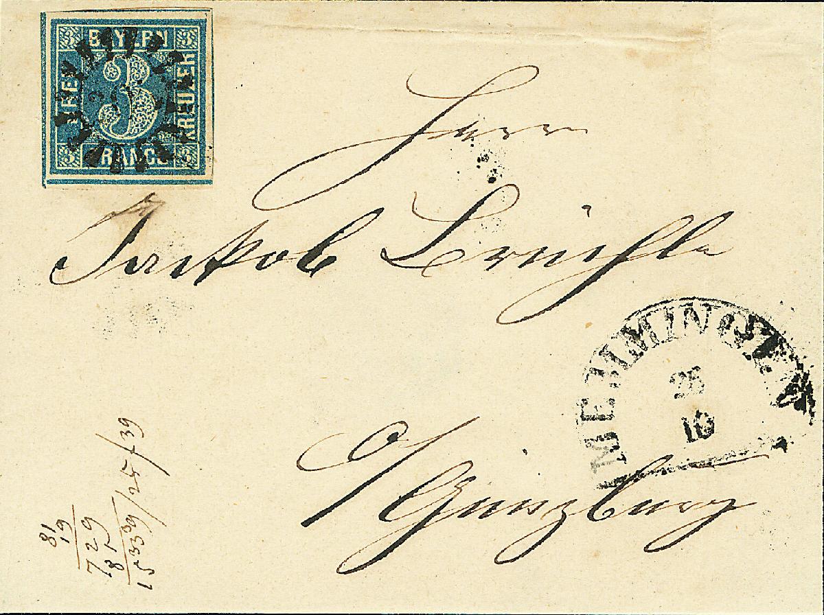 | Zusatzinformationen und Suchstichworte: | Dr. Derichs 173. Auktion 4. November 2023 Los 533 Altdeutschland Bayern 3 Kreuzer dunkelblau, Platte 1, gute "b"-Farbe, allseits breitrandig mit vier Zwischenlinien als Einzelfrankatur auf kleinem Brief (Hülle neu gefaltet, ohne Bedeutung) mit geschlossenem Mühlradstempel "205" und Halbkreis-Nebenstempel "Memmingen 26/10" (1850) nach Günzburg. Kabinett. Die Marke stammt vermutlich vom unteren Bogenrand eines oberen Viertelbogens. Auf Brief in der "b"-Farbe eine seltene und unterschätzte Marke. Ausruf 150,00 EUR |