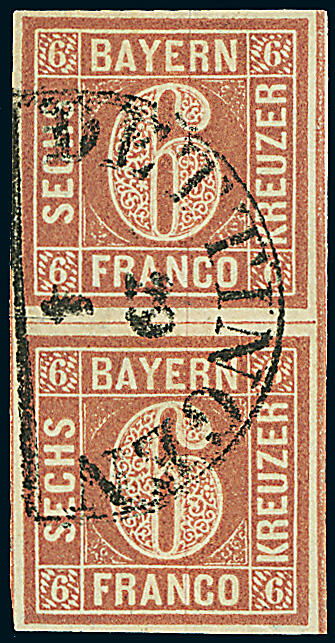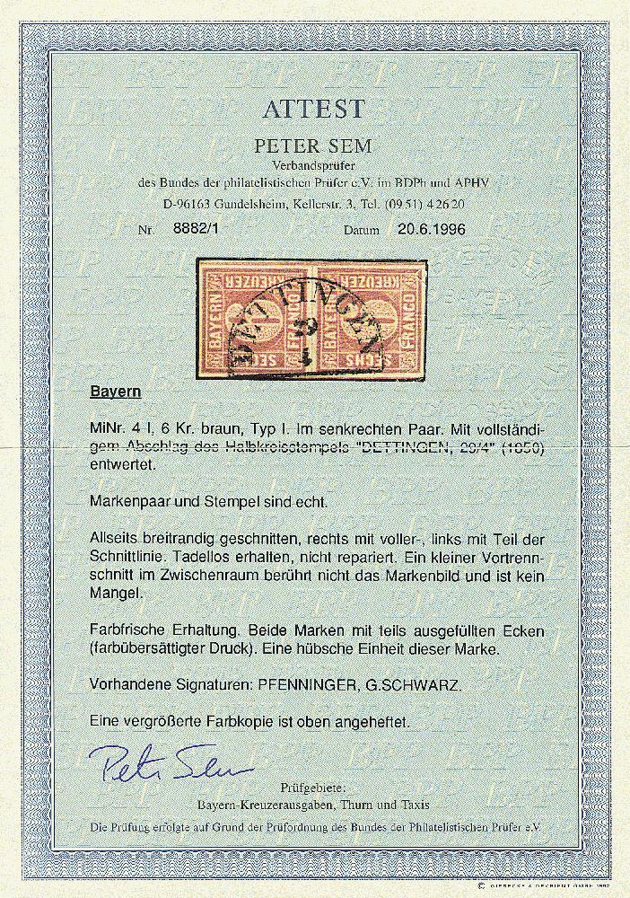 | Zusatzinformationen und Suchstichworte: | Dr. Derichs 173. Auktion 4. November 2023 Los 543 Altdeutschland Bayern 6 Kreuzer braun, Type "I", farbübersättigter Druck mit teils ausgefüllten Ecken, senkrechtes Doppelstück, allseits breitrandig bzw. rechts mit voller und links mit teilweiser Zwischenlinie, ein vollständig aufgesetzter Halbkreisstempel "Dettingen 29/4". Luxus. Ein kleiner Vortrennschnitt links befindet sich nur im Markenzwischenraum und stellt keinen Mangel dar. Eine seltene Einheit dieser besseren Marke. Fotoattest Sem BPP: "Tadellos erhalten, nicht repariert... Farbfrische Erhaltung. Beide Marken mit teils ausgefüllten Ecken (farbübersättigter Druck). Eine hübsche Einheit dieser Marke.". (Michel 1.500.-+; dieser Preis bedarf im Michel einer Korrektur, da ein Doppelstück der Normalmarke ohne ausgefüllte Ecken mit dem gleichen Preis katalogisiert ist, wohingegen eine Einzelmarke den doppelten Katalogwert hat.) Ausruf 600,00 EUR |