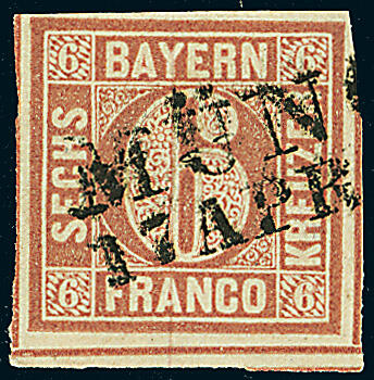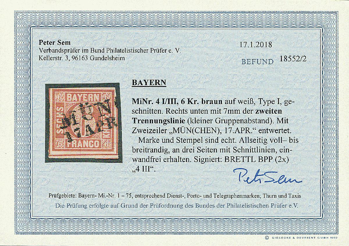 | Zusatzinformationen und Suchstichworte: | Dr. Derichs 173. Auktion 4. November 2023 Los 546 Altdeutschland Bayern 6 Kreuzer braun, Type "I", voll- bis breitrandig mit Zwischenlinien links, rechts und unten sowie einem Teil der doppelten Trennungslinie unten rechts, Luxusstück mit Zweizeiler "München 17 Apr.". Doppelt geprüft Brettl BPP sowie Fotobefund Sem BPP: "einwandfrei erhalten". (Michel 650.-). Ausruf 150,00 EUR |
