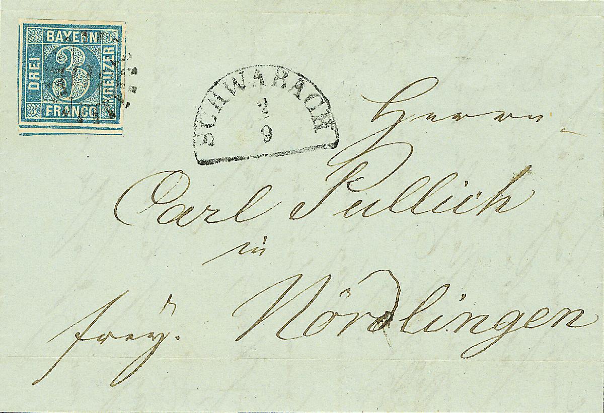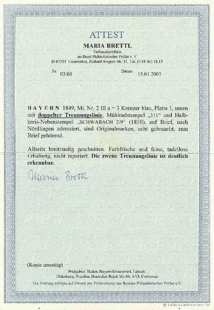 | Zusatzinformationen und Suchstichworte: | Dr. Derichs 173. Auktion 4. November 2023 Los 548 Altdeutschland Bayern \DOPPELTE TRENNUNGSLINIE UNTEN\: 3 Kreuzer, Platte 1, vierseitig sehr breitrandig, unten mit doppelter Trennungslinie, wobei beide Linien durchgehend erhalten sind, auf frischem Brief mit geschlossenem Mühlradstempel "311" und Halbkreis-Nebenstempel "Schwabach 2/9" (1850) nach Nördlingen. Luxus. Fotoattest Brettl BPP: "Farbfrische und feine, tadellose Erhaltung, nicht repariert. Die zweite Trennungslinie ist deutlich erkennbar.". (Michel 1.200.-) Ausruf 150,00 EUR |