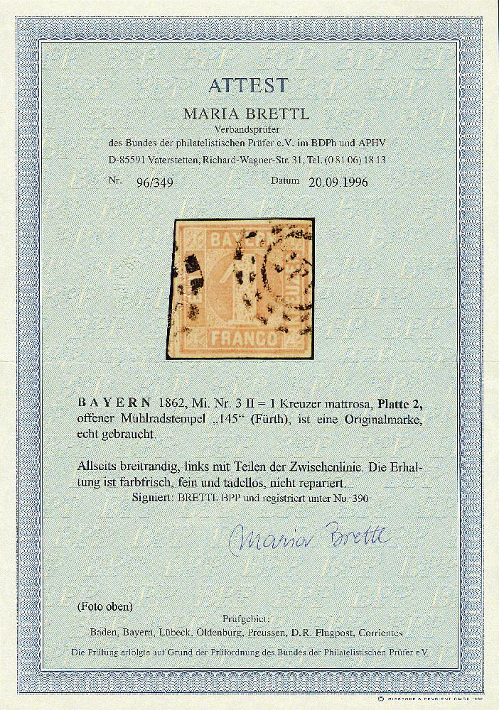 | Zusatzinformationen und Suchstichworte: | Dr. Derichs 173. Auktion 4. November 2023 Los 550 Altdeutschland Bayern 1 Kreuzer helllilarosa, seltene Platte 2 ("spitze Ecken"), voll- bis breitrandig mit offenem Mühlradstempel "145" FÜRTH. Luxus. Die Marke zeigt die Plattenfehler "linke Randlinie gespalten" und "Beschädigung der rechten unteren Ecke", die bei Vogel unter "PF VII" zusammengefasst sind. Auch ohne Plattenfehler ist die "3II" echt gestempelt eine der seltensten Marken der bayerischen Kreuzerzeit. Fotoattest Brettl BPP und Fotoattest Sem BPP: "einwandfrei erhalten". (Michel 2.000.-+, das ist der Preis für eine normale Marke ohne Aufschlag für die Plattenfehler.) Ausruf 800,00 EUR |