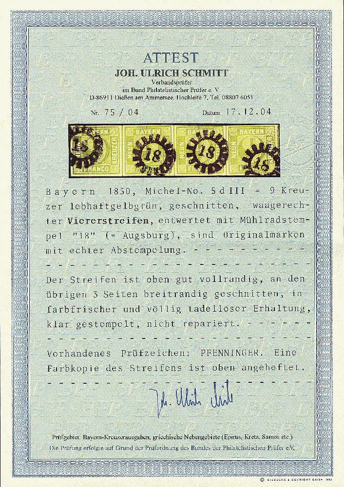 | Zusatzinformationen und Suchstichworte: | Dr. Derichs 173. Auktion 4. November 2023 Los 563 Altdeutschland Bayern 9 Kreuzer lebhaftgelbgrün, Type "III", waagerechter Viererstreifen, allseits voll- bis breitrandig und in frischer, leuchtender Farbe, jede Marke einzeln klar gestempelt mit geschlossenem Mühlradstempel "18" AUGSBURG. Luxus. Eine in dieser völlig einwandfreien Qualität seltene Einheit. Jede Marke tiefst geprüft Pfenninger und Fotoattest Schmitt BPP: "in farbfrischer und völlig tadelloser Erhaltung, klar gestempelt, nicht repariert". (Michel 4.000.-) Ausruf 750,00 EUR |