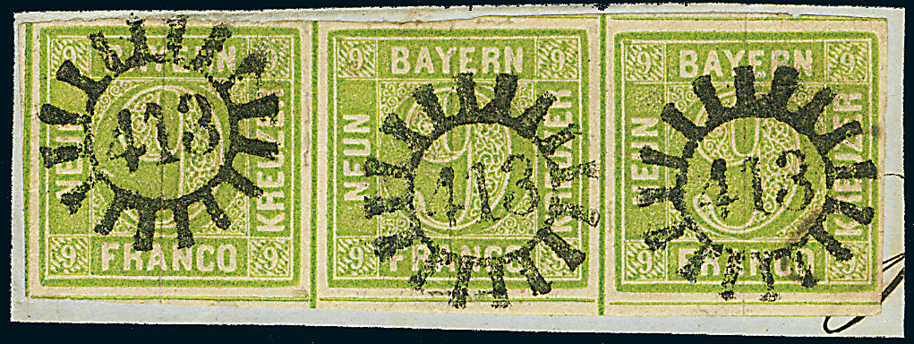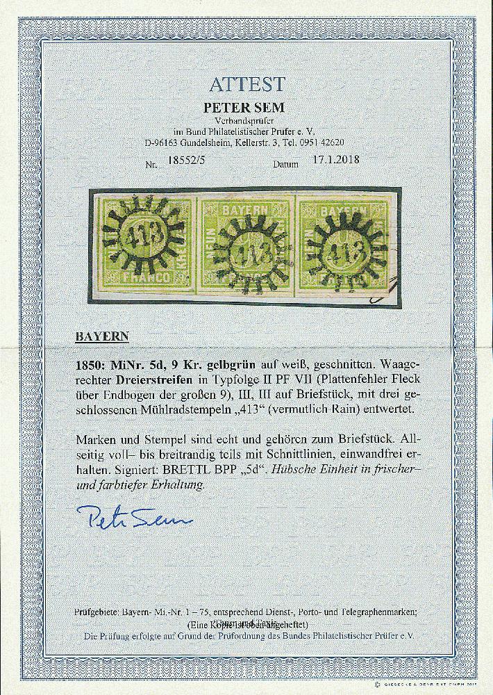 | Zusatzinformationen und Suchstichworte: | Dr. Derichs 173. Auktion 4. November 2023 Los 564 Altdeutschland Bayern 9 Kreuzer gelbgrün, waagerechter Dreierstreifen in der Typfolge "II-III-III", allseits voll- bis breitrandig bzw. überwiegend mit Zwischenlinien, auf Briefstück mit drei klar aufgesetzten geschlossenen Mühlradstempeln "413". Luxus. Die linke Marke zeigt den Plattenfehler "VII" = "Fleck über Endbogen der großen Wertziffer 9". Geprüft Brettl BPP und Fotoattest Sem BPP: "einwandfrei erhalten... Hübsche Einheit in frischer und farbtiefer Erhaltung." Ausruf 200,00 EUR |