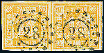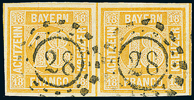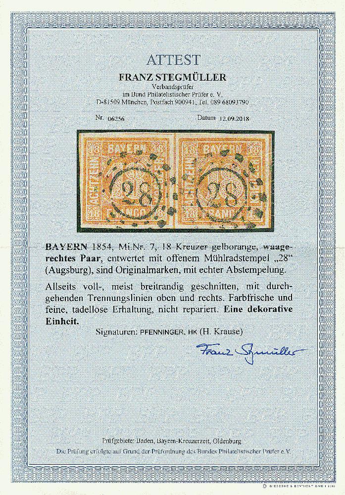 | Zusatzinformationen und Suchstichworte: | Dr. Derichs 173. Auktion 4. November 2023 Los 569 Altdeutschland Bayern 18 Kreuzer gelborange, ringsum voll- bis breitrandiges waagerechtes Paar, oben und rechts mit durchgehenden Zwischenlinien, jede Marke klar und gerade gestempelt mit offenem Mühlradstempel "28" AUGSBURG. Luxus. Fotoattest Stegmüller BPP: "Farbfrische und feine, tadellose Erhaltung, nicht repariert. Eine dekorative Einheit.". (Michel 1.200.-+) Ausruf 450,00 EUR |