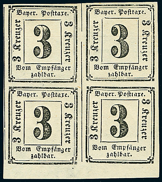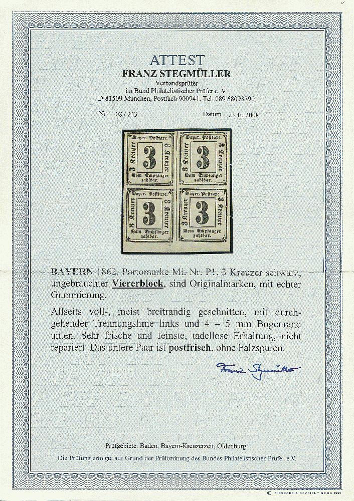 | Zusatzinformationen und Suchstichworte: | Dr. Derichs 173. Auktion 4. November 2023 Los 575 Altdeutschland Bayern Portomarke 3 Kreuzer schwarz, voll- bis breitrandiger Viererblock vom Unterrand (5mm breiter Bogenrand), links mit vollständiger und "freistehender" Zwischenlinie bei beiden Marken, ungebraucht mit vollständiger Originalgummierung, welche für das untere Paar das Prädikat "POSTFRISCH" erfordert. Luxus. Unsigniert, Fotoattest Stegmüller BPP: "Sehr frische und feinste, tadellose Erhaltung, nicht repariert. Das untere Paar ist postfrisch, ohne Falzspuren.". (Michel 950.-+, das ist der Preis für zwei waagerechte Paare ohne Aufschlag für das Blockstück und die Unterrand-Position.). Ausruf 200,00 EUR |
