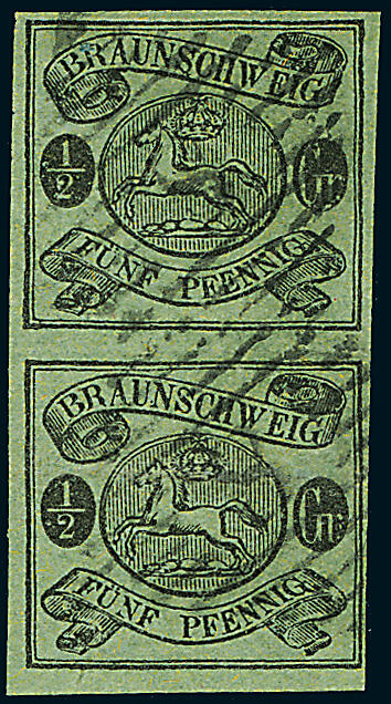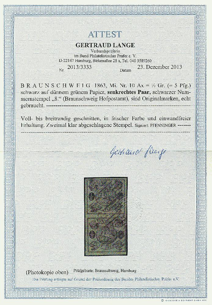 | Zusatzinformationen und Suchstichworte: | Dr. Derichs 173. Auktion 4. November 2023 Los 602 Altdeutschland Braunschweig 1/2 Groschen schwarz auf grün, Papiervariante "auf dünnem Papier", senkrechtes Paar, voll- bis breitrandig mit Nummernstempel "8" BRAUNSCHWEIG. Ein insbesondere in senkrechter Form seltenes Doppelstück. Geprüft Pfenninger und Fotoattest Lange BPP: "in frischer Farbe und einwandfreier Erhaltung". (Michel 1.200.-+, dabei kein Aufschlag für die senkrechte Form der Einheit gerechnet) Ausruf 250,00 EUR |