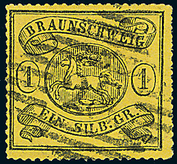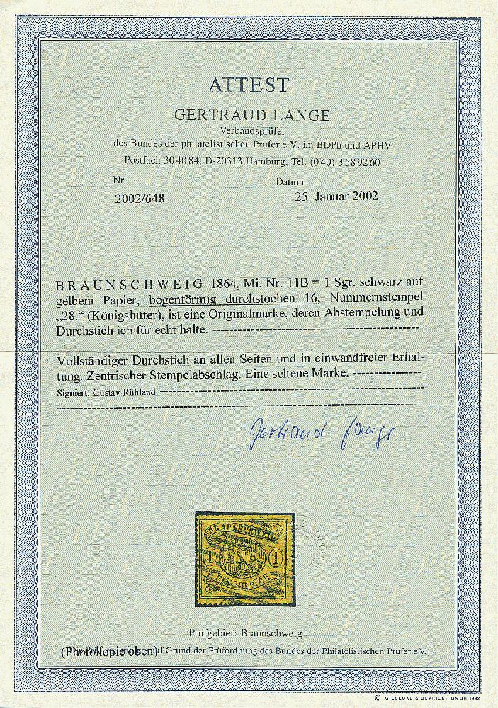 | Zusatzinformationen und Suchstichworte: | Dr. Derichs 173. Auktion 4. November 2023 Los 605 Altdeutschland Braunschweig 1 Silbergroschen schwarz auf gelb, bogenförmiger Versuchsdurchstich, zentrisch gestempelt mit Nummernstempel "28." KÖNIGSLUTTER. Luxus. Fotoattest Lange BPP: "Vollständiger Durchstich an allen Seiten und in einwandfreier Erhaltung... Eine seltene Marke." Ausruf 400,00 EUR |