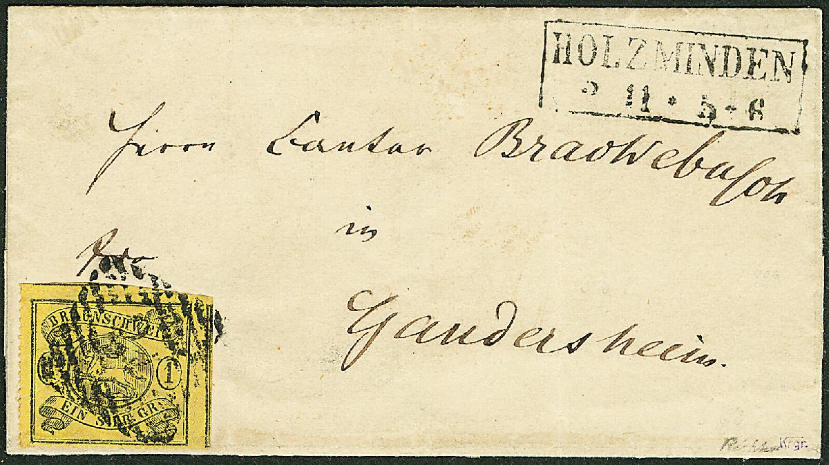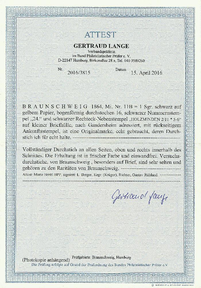 | Zusatzinformationen und Suchstichworte: | Dr. Derichs 173. Auktion 4. November 2023 Los 607 Altdeutschland Braunschweig 1 Silbergroschen schwarz auf gelb, bogenförmiger Versuchsdurchstich, ringsum einwandfreier Durchstich, dieser oben und rechts "innerhalb" mit Teilen der oberen und rechten Nachbarmarke, auf kleinem Brief mit Nummernstempel "24." und Aufgabe-Ra2 "Holzminden 2/11" nach Gandersheim mit rückseitigem blauen Ra2 "Gandersheim". Luxus. Auf Brief eine der großen Altdeutschland-Seltenheiten. Fotoattest Georg Richter (1937), Fotoattest Brettl BPP und Fotoattest Lange BPP: "Die Erhaltung ist in frischer Farbe und einwandfrei. Versuchsdurchstiche von Braunschweig, besonders auf Brief, sind sehr selten und gehören zu den Raritäten von Braunschweig.". (Michel 11.000.-) Ausruf 3.500,00 EUR |